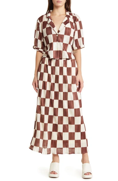 Feel all eyes turn to you in this checked plissé set featuring a bell-sleeve top and matching skirt with handy pockets.