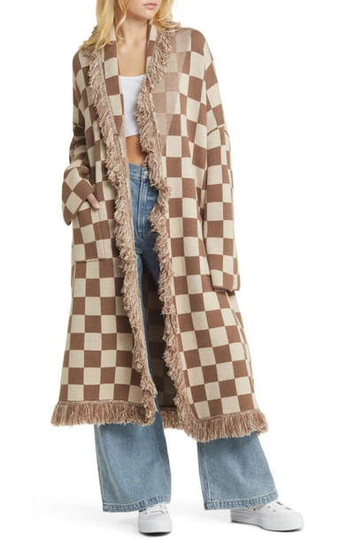 Feel the warmth of this longline open-front cardi designed in a checked pattern and feathery fringed trim.