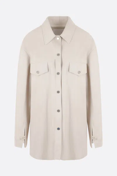 Drome's jacket crafted in ivory nappa. Featuring pointed collar, front logoed metallic button closure, long sleeves with buttoned cuffs, front pockets and straight raw-cutted hem. Unlined interior.