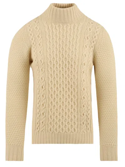 Description White color lambswool turtleneck sweater from Drumhor with Aran knitting .
