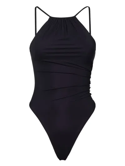 Evening glamour meets beach chic. Go seamlessly from day to night in this high-leg swimsuit, flaunting a cheeky Brazilian cut and asymmetrical scoop back. Throw on a sheer cover-up for maximum elegance.   Highlightsblackastmmetrical scoop backhigh-leg cut   CompositionPolyamide 72%, Elastane 28%
