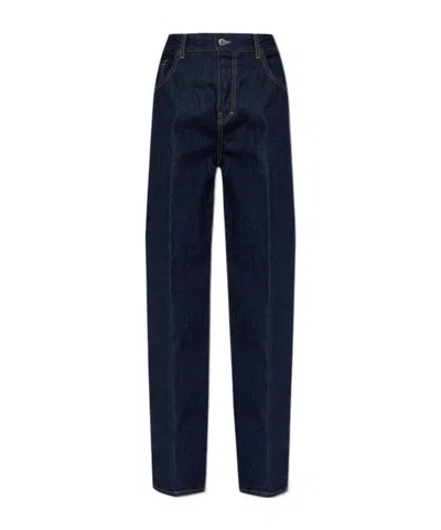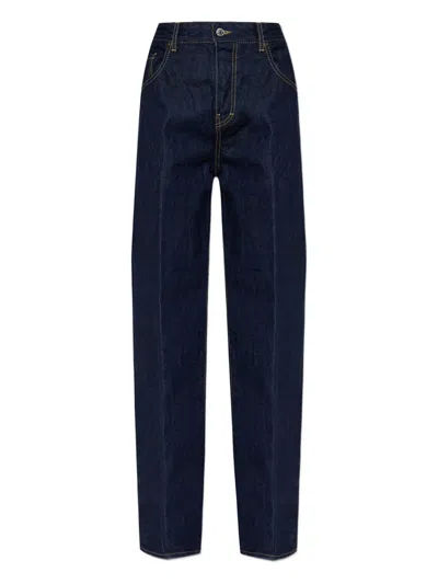 navy blue front button fastening classic five pockets embroidered logo straight leg