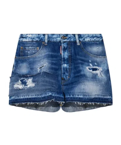 blue distressed denim frayed edge paint splatters five-pocket styling