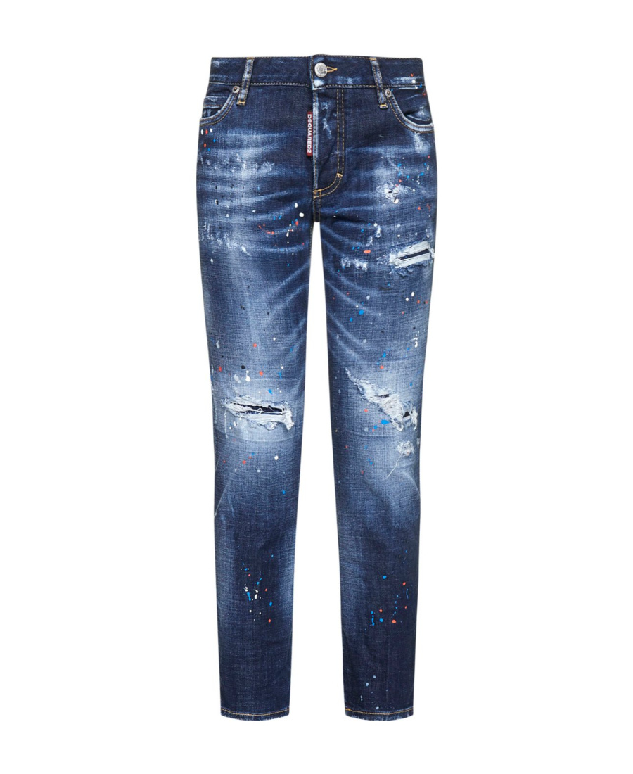distressed-effect cropped jeans from DSQUARED2 featuring blue, cotton blend, calf leather, distressed effect, belt loops, logo patch to the rear, concealed fly and button fastening, classic five pockets and cropped.