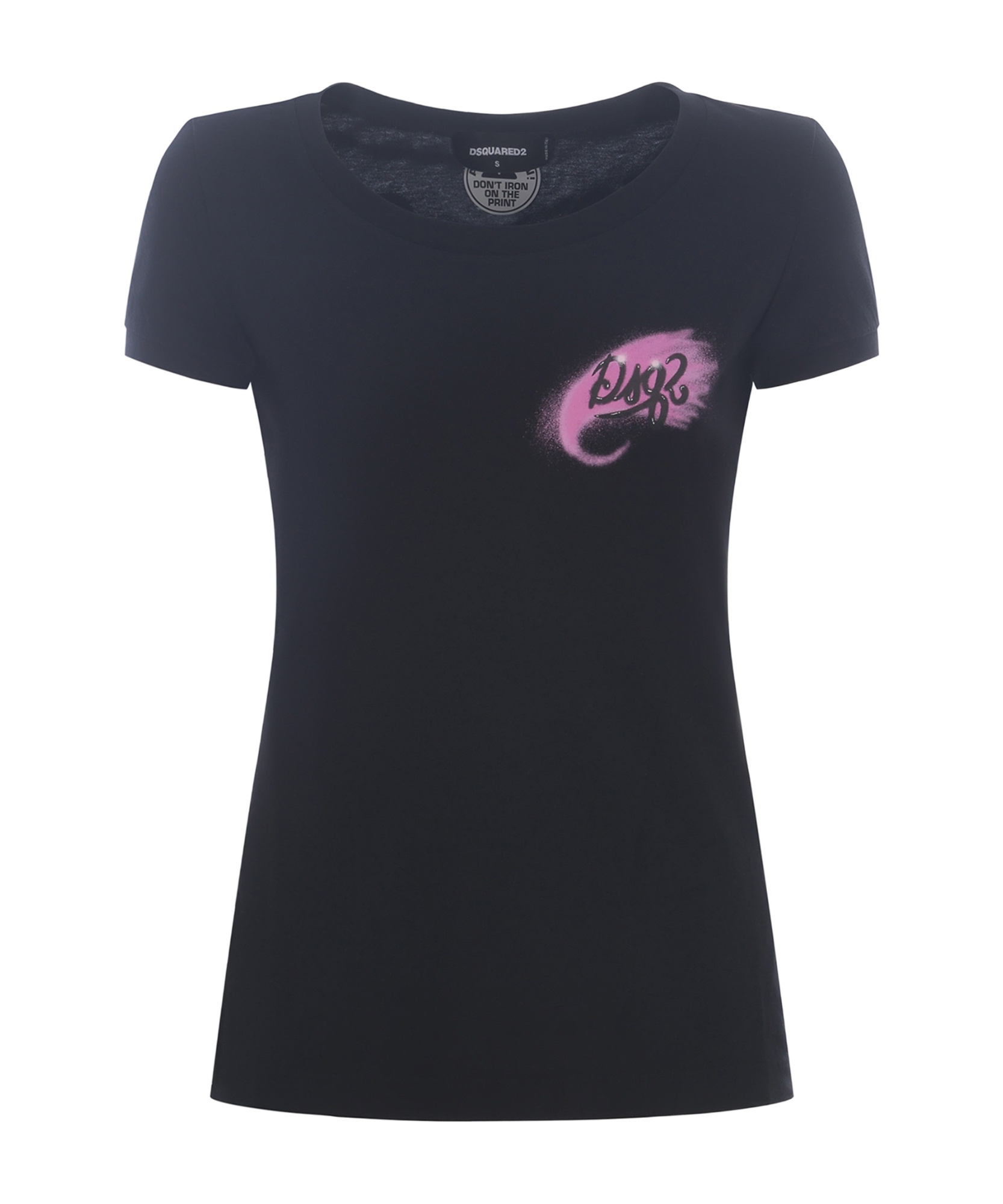 T-shirt Dsquared2 made of Black cotton jersey. Wide ribbed crew neck. Short sleeves. Contrasting Fuchsia Dsq2 logo print on the chest. Maxi contrasting logo print on the back. Slim fit. 100% Cotton Made in Italy Composition: 100% Cotton