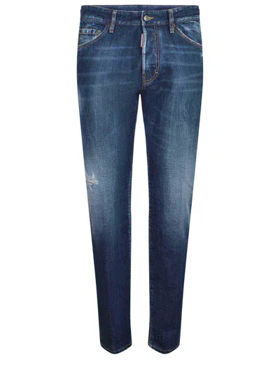 Dsquared2 "Cool Guy" jeans made from medium blue denim. Stone wash effect. Micro rips. Button closure. Belt loops. Red embroidered label on the closure. Five pockets. Logo patch embroidered on the back in suede leather in a leather color. 100% cotton
