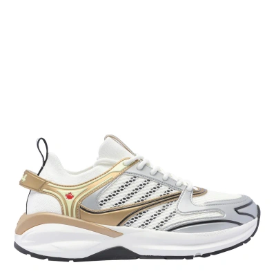 Dash panelled mesh sneakers from DSQUARED2 featuring off-white, silver-tone, gold-tone, panelled design, mesh panelling, maple leaf print, round toe, front lace-up fastening, logo-print tongue, double pull-tab at the opening, sock-style ankle and chunky rubber sole.