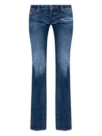 blue distressed detail faded wash whiskering yellow topstitching low rise