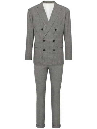 grey Prince of Wales check print Blazer peak lapels double-breasted button fastening slit pocket at the chest two front flap pockets long sleeves buttoned cuffs American rear vent straight hem Trousers mid-rise tapered leg slip pockets to the sides turn-up hem pressed crease The crease-effect on this piece is very much intentional, no ironing necessary.