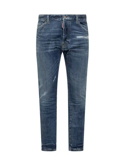 Dsquared2 men's blue stretch denim jeans with used effect. Slim fit, distressed details, button closure, iconic red label on breast pocket.