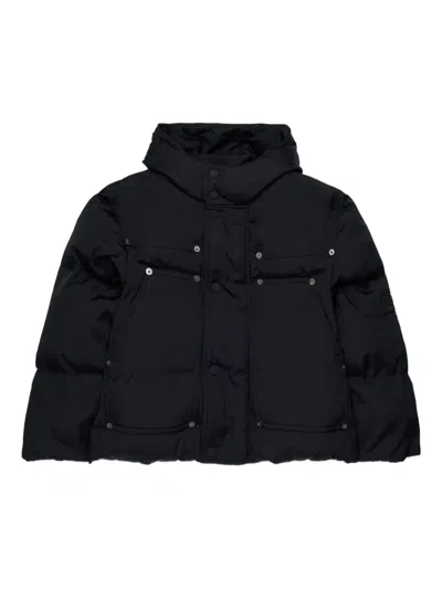 black front press-stud and zip fastening two front patch pockets classic hood rivet detailing