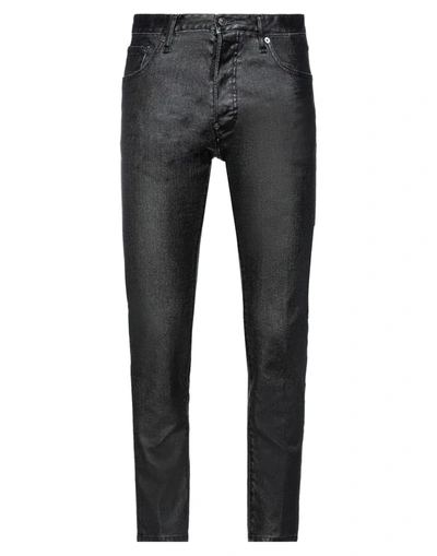 denim, coated effect, colored wash, leather applications, brand logo, mid rise, solid color, belt loops, slim-leg pants, tapered leg, button closing, five pockets, stretch, contains non-textile parts of animal origin , Color: Black , Size: 38