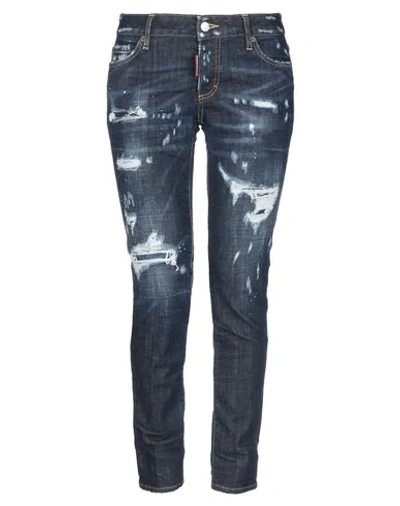 denim, faded, worn effect, logo, solid color, dark wash, low waisted, front closure, button closing, multipockets , Color: Blue , Size: 2