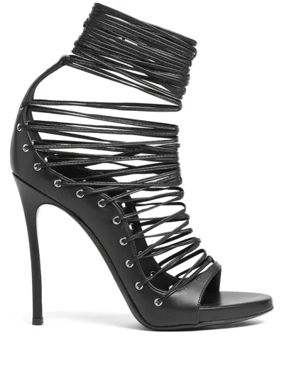 black leather smooth grain tie-fastening ankle strap high stiletto heel metal eyelet detailing open toe branded leather insole leather sole