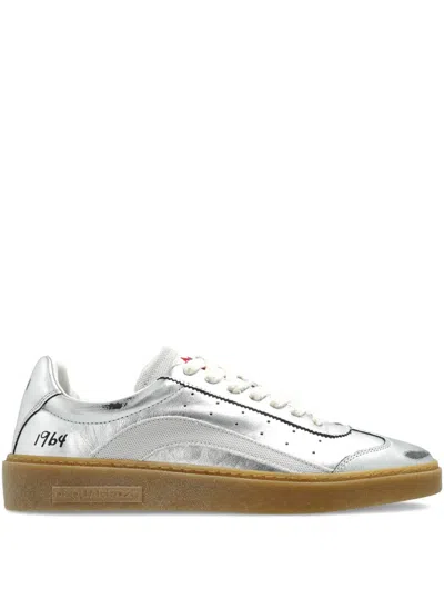 Dsquared2 presents a striking low-profile sneaker that embodies modern sophistication. The upper combines a shiny metallic finish with calf leather and polyester, enhancing its contemporary allure. Cream-colored laces and perforated detailing add refined texture, while the gum rubber sole ensures comfort and durability. Noteworthy heel accents contribute a unique character, making this sneaker a versatile choice for casual outings. Composition - 65% calf leather, 35% polyester Made in - Not specified