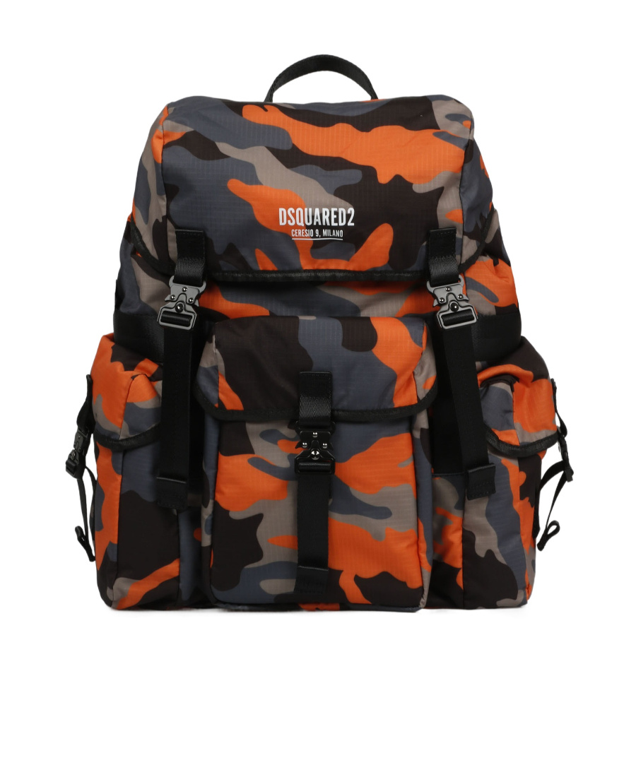 Camouflage printing Rope seal with adjustable clasp flip Trumpet 'DSQUARED2 CERESIO 9, MILANO' printing Front zipper pocket Side clasp pocket Top handle Adjustable shoulder strap on back Maple leaf mesh back of the eye Inside zipper bag
