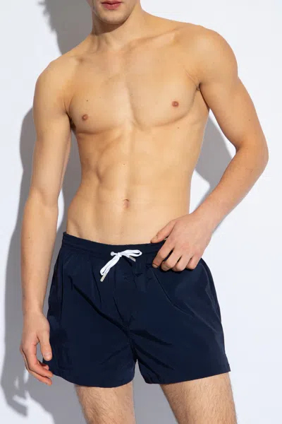 Navy blue swimming shorts from Dsquared2. This pair features adrawstring waistband, two slip pockets and one zip pocket with a logopendant.