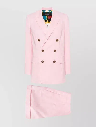 Material: 54% polyester, 44% virgin wool, 2% elastane. Blazer. Peaked lapels. Padded shoulders. Long sleeves. Front double-breasted closure. Chest welt pocket. Two front flap pockets. Buttoned cuffs. Double back vent. Pants. Belt loops. Front button and zip closure. Two side slit pockets. Two rear welt pockets. Turn-up hem. Made in Italy