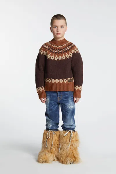 Dsquared2 - Long-sleeved, turtleneck pullover made of coarse wool-blend yarn in a Norwegian pattern. A warm and enveloping garment, it is embellished with the Dsquared2 patch applied to the bottom. * High-necked * Long sleeves * Dsquared2 patch on the bottom * Norwegian pattern * Ribbed cuffs and bottom hem * Made of wool blend * Unisex model, designed for all kids