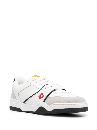 x Pac-Man panelled low-top sneakers from DSQUARED2 featuring white/multicolour, calf leather, suede panels, embroidered motif, logo patch at the tongue, embroidered logo to the rear, logo at the sole, branded insole, contrasting heel counter, perforated toebox, round toe, front lace-up fastening and flat rubber sole.