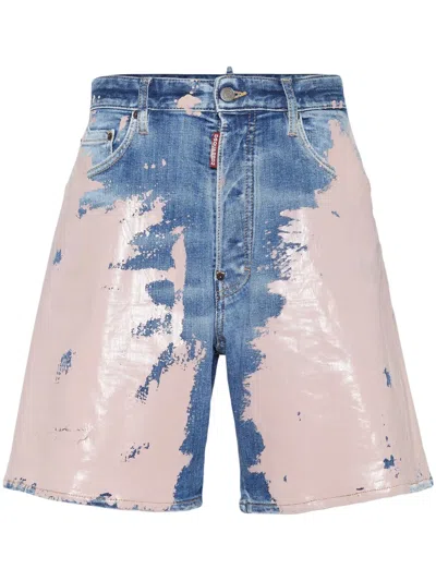 indigo blue/light pink stretch-cotton washed denim concealed fly and button fastening mid-rise belt loops rivet detailing classic five pockets painterly print appliqué logo knee-length
