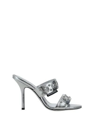 Calfskin Sandals by Dsquared2, double strap on the back of the foot embellished with metallic cut-out details, leather stiletto heel, press-studded logo insole, open front round toe.