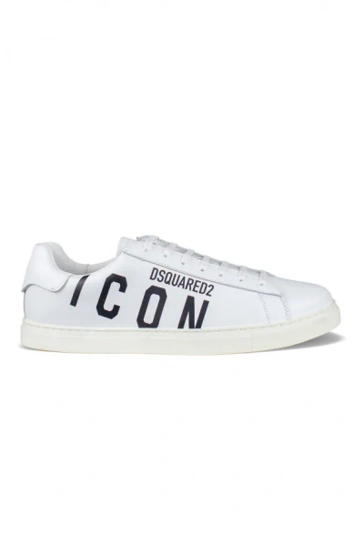 Dsquared2 white leather low top sneakers.Black Dsquared2 Icon logo diagonally across the outside.White leather counter.White laces.White rubber sole.Made in Italy..