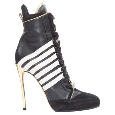 rare DSQUARED2 Vintage black white striped gold heel sneaker boots EU37Reference - NKLL/A00481Brand - Dsquared2Material - Suede, LeatherColor - Black, WhitePattern - StripedClosure - Lace UpLining - Black LeatherExtra Details - "Kick it! Dsquared" metal logo plate on laces.Made in - ItalyCONDITION - Condition - Good, this item was pre-owned and is in good condition. Please refer to image gallery for thorough condition check. Color transfers at both sides of heels. Slightly scuffed heels. Micro scuffed marks on suede leather. Slight dents.SIZINGDesigner size - EU37Size reference - EU37 / US7 / UK4 / JP24.5Dsquared2. This Dsquared2.