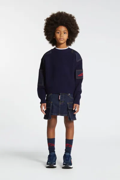 Dsquared2 - Crew-neck crew-neck pullover in rib-knit wool blend with denim inserts. A patch with logo from Icon New Generation embroidered in contrasting color stands out on the sleeves. Perfect for creating casual original looks. * Crew-neck * Long sleeves * Icon New Generation logo patch on sleeve * Ribbed construction * Denim inserts on shoulders and sleeves * Made of wool-blend knit * Unisex model, designed for all kids
