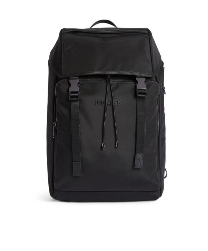 rear zip-fastening pocket | wrist strap | Top handle | Adjustable shoulder straps | Front zip pocket | Metal hardware | logo patch to the front | top zip fastening | Drawstring closure