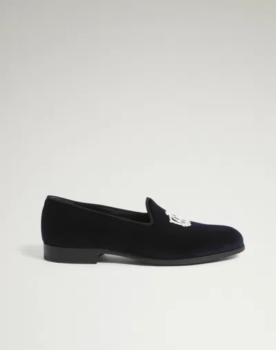 The ultimate indulgence for the man of taste, these midnight-blue slippers feature intricate AD Cypher embroidery and a modern Blake flex construction. Their rubber-injected soles provide both comfort and durability. Midnight Blue AD Cypher Slipper AD cypher cotton embroidery Blake flex construction Tonal leather quilted Nappa lining Rubber injected leather sole