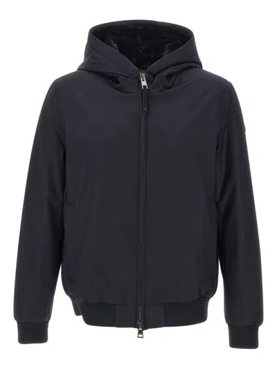 blue front zip closure hooded neckline side zip pockets ribbed edges