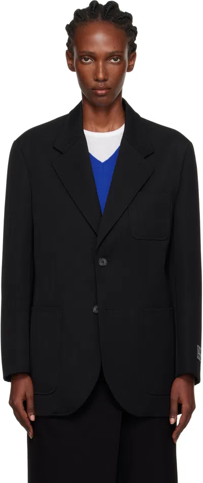Notched lapels, button closure at front, long sleeves, front patch pockets, and logo patch at cuffs.