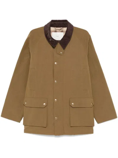 Dunst Hunting technical jacket in beige-coated cotton blend with classic brown corduroy collar, adjustable button strap detail, button closure and hidden zip, two side button flap pockets, and straight hem. Composition: 60% Cotton, 28% Polyester, 12% Nylon