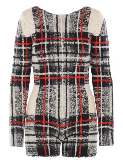 Duran Lantink jumpsuit crafted in wool knit with a check pattern in cream, black, and red tones. Featuring a crew neckline, back zip closure, long sleeves, shorts-style pants, and ribbed trims.