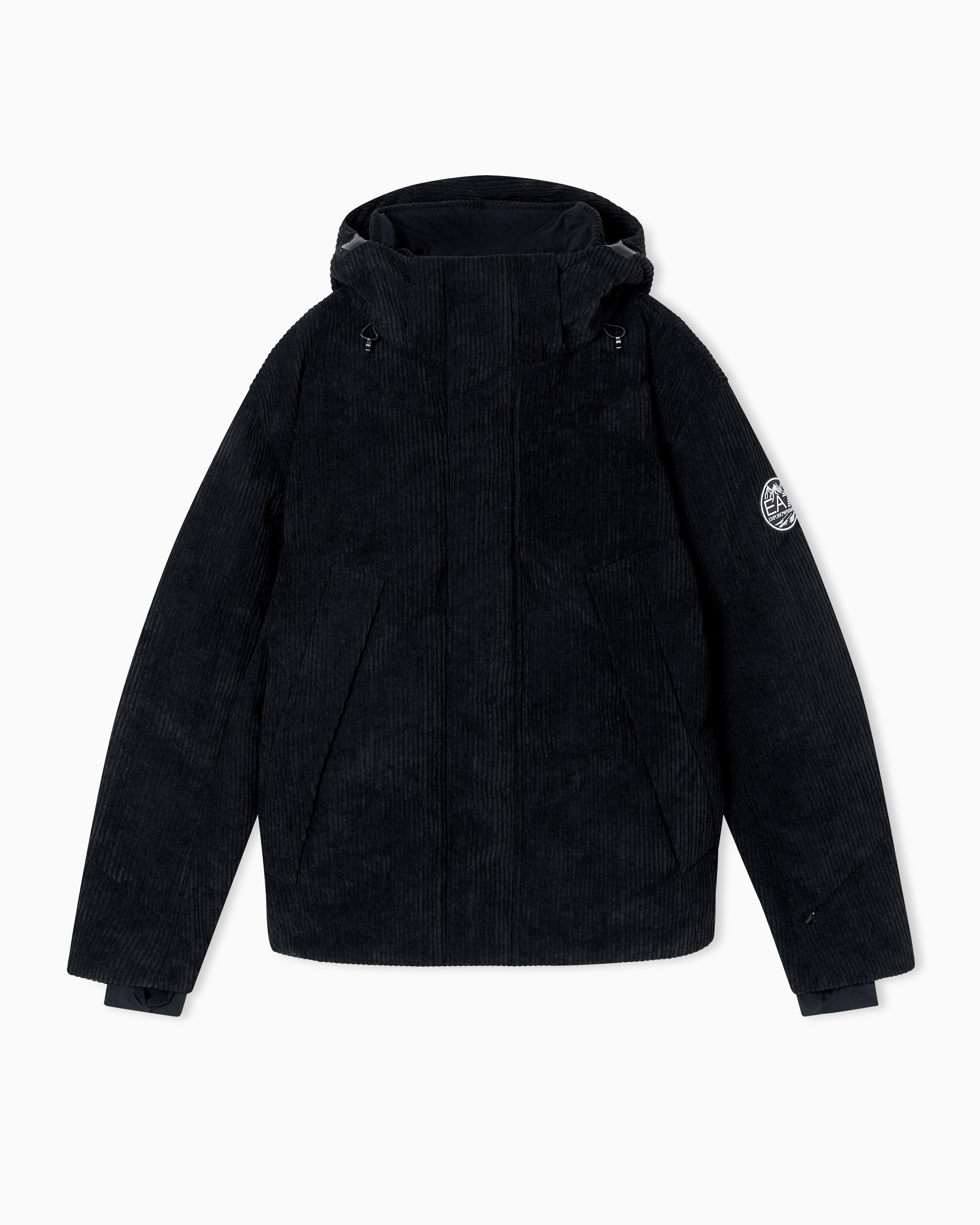 Ski down jacket with warm duck down filling, made of medium corduroy, which is waterproof, breathable and water-repellent. With a hood, four practical zipped front pockets, numerous internal compartments and a customised collection EA7 patch on the left sleeve, it is perfect for enjoying winter sports to the full in total comfort with a dash of incomparable style.
