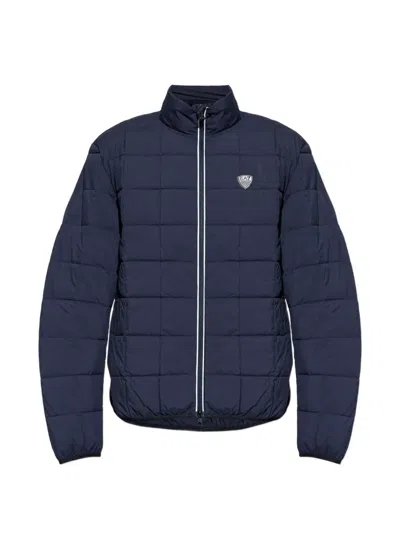 navy blue quilted finish logo patch zip fastening high neck long sleeves