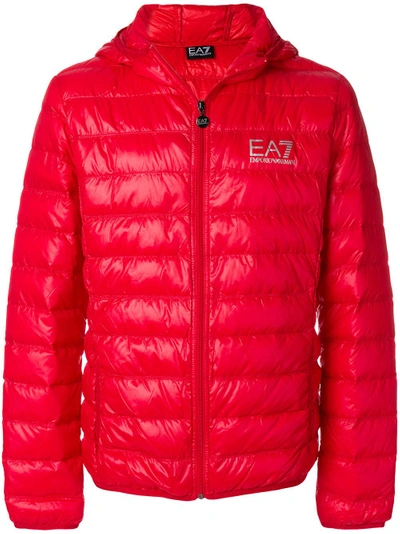Racer red feather down padded logo jacket from Ea7 Emporio Armani featuring a hood, a front zip fastening, long sleeves, a padded interior, a printed logo to the front and a slim fit.