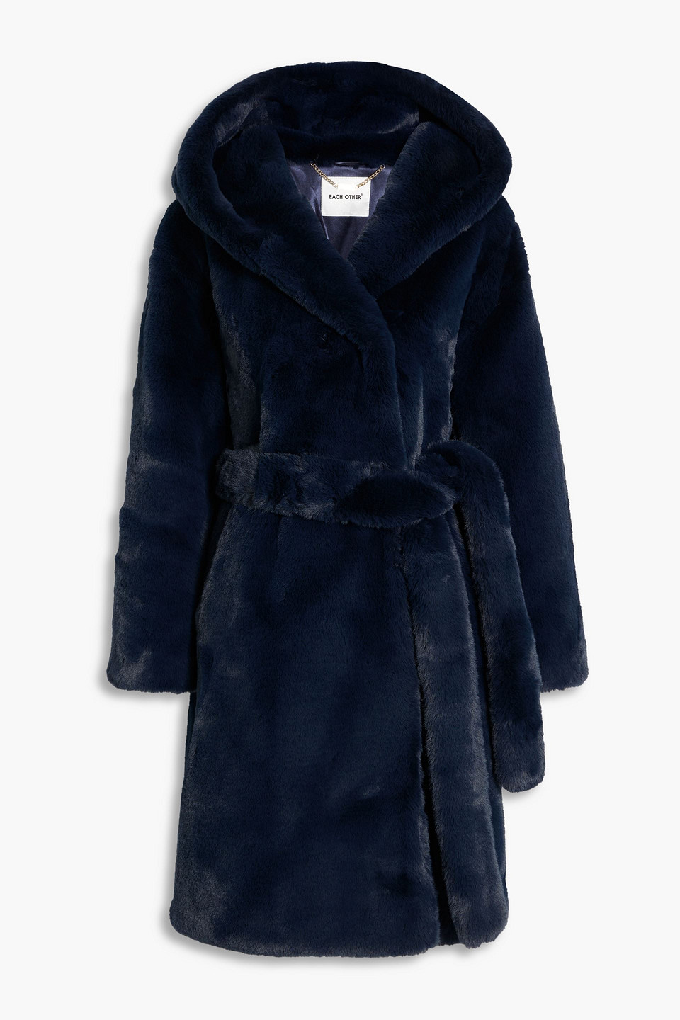 faux-fur hooded coat from EACH X OTHER featuring navy blue, shawl lapels, slouchy hood, concealed front button fastening, belted waist, long sleeves, straight hem and two side welt pockets.