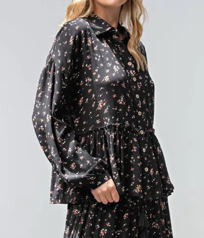 A timeless blouse that will never go out of style.Elevate your boho style with the Midnight Meadow Peplum Blouse, a dreamy blend of vintage charm and effortless elegance. This flowy black top features a delicate floral print, soft pleated peplum hem, and billowy long sleeves for a relaxed, romantic silhouette. The button-down front adds a touch of sophistication, while the cinched waistline offers a flattering fit. Perfect for transitioning through seasons, pair it with jeans or a matching maxi skirt for a chic, laid-back look.