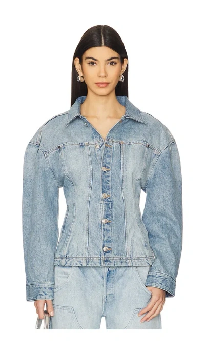 EB Denim Prima Jacket in Windemere. Size XS (also in L, M, S, XL). 95% organic cotton 5% post consumer waste yarn. Made in Pakistan. Machine wash. Front button closure. Side seam pockets. Buttoned cuffs. Denim fabric with darted waist design. EBDR-WO16. W1701PRMJK. About the designer: