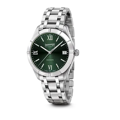 Collection: Aquadate Grande TailleSize: 41 mmColor: Green with Vagues-Droites processing. Tour of the Hours with Indexes in Applique with Blue LuminescenceCase: Steel with glass Sapphire Anti-scratch and Anti-reflective Piano. Fixed bezel, with circular satin, 4 Appliques knights with Lucida finish, Polished indexes in bas-reliefFund:8 screw clamped steel with engravingsStrap:Steel model Charm with Deployante Declic closure Water resistance: 10 ATM