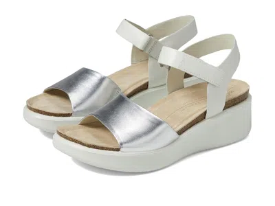 ECCO Flowt Wedge Cork Sandal - Women's Shoes : Silver/White : Made with soft brushed nubuck, this version of the ECCO FLOWT WEDGE CORK Sandal has a single wide strap across the top of the foot and a fully adjustable ankle strap. Chic and understated, one of the styles features an edgy snake-print pattern, while the wedge heel on all of them offers comfort and height. ; Crafted from brushed nubuck leather, made in the brands own tanneries. ; Concealed elastic inset offers extra width and a better fit. ; Ankle strap offers a secure fit with an adjustable, quick-fastening closure. ; ECCO CORKSPHERE Suspended Footbed adapts to the shape of your foot for a unique fit. ; Lightweight sole provides cushioning and flexibility, using innovative ECCO FLUIDFORM Direct Comfort Technology. ; Washable suede-covered footbed delivers a soft, luxe feel and added comfort. ; Imported. Measurements: ; Heel Height: 2 in ; Weight: 14 oz ; Platform Height: 1 in ; Product measurements were taken using size EU 40 (US Women's 9-9.5), width M. Please note that measurements may vary by size. | ECCO Flowt Wedge Cork Sandal Women's Shoes Silver/White : EU 35 (US Women's 4-4.5) M, Suede