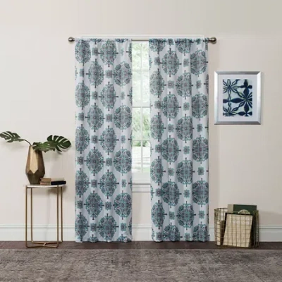Redecorate in a snap with Eclipse Olivia Thermaweave room-darkening window curtain panel. These beautiful panels offer a superior blend of window fashion design and light blocking technology for any decor. This medallion print curtain is woven with energy saving yarns so that the technology blends seamlessly with fashion fabrics. Each Olivia window panel measures 37 In. wide by your choice 63, 84, or 95 In. long. 3 In. rod pocket accommodates up to a 1.50 In. curtain rod. Curtain rod sold separately. Sold as a single panel. 100% Polyester. Machine wash gentle cycle, tumble dry, do not bleach. Imported.Number of Panels: 1Included: 1 Panel(s)Top Construction: Rod PocketTop Opening: 3 In Rod PocketUse: IndoorFiber Content: 100% PolyesterFabric Description: WovenLight Filtration: Light-FilteringCare: Tumble Dry, Machine WashCurtain Length: 84 InchCurtain Width: 38 InchBack of Curtain Color: Same As Front of CurtainCountry of Origin: Imported