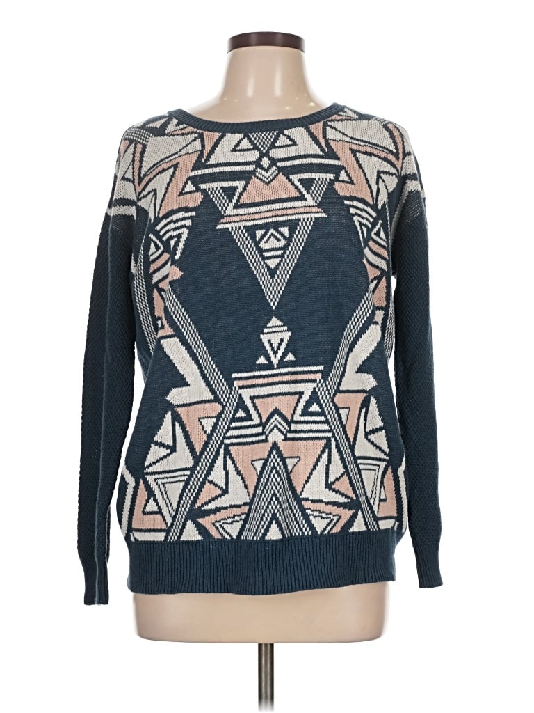 Ecote Pullover Sweater, Size: Large. Item Details: Blue, Print Pattern, Crew Neck, Long Sleeve, Women's Tops, Cotton/Rayon