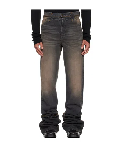 Non-stretch jeans featuring fading and whiskering details, a detachable waistband, press-stud belt loops, five-pocket styling, a zip fly, and zippered panels at the cuffs.