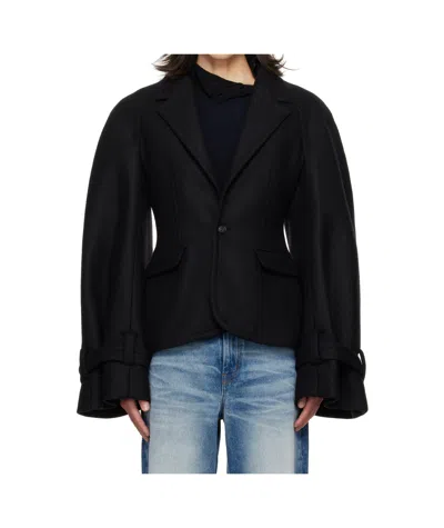 Melton blazer with notched lapels, a button closure at front, front flap pockets, raglan sleeves, pin-button cuffs, a central vent at the back hem, internal welt pockets, and a full satin lining.