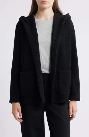 EILEEN FISHER Open Front Recycled Wool Blend Bouclé Hooded Jacket In Black