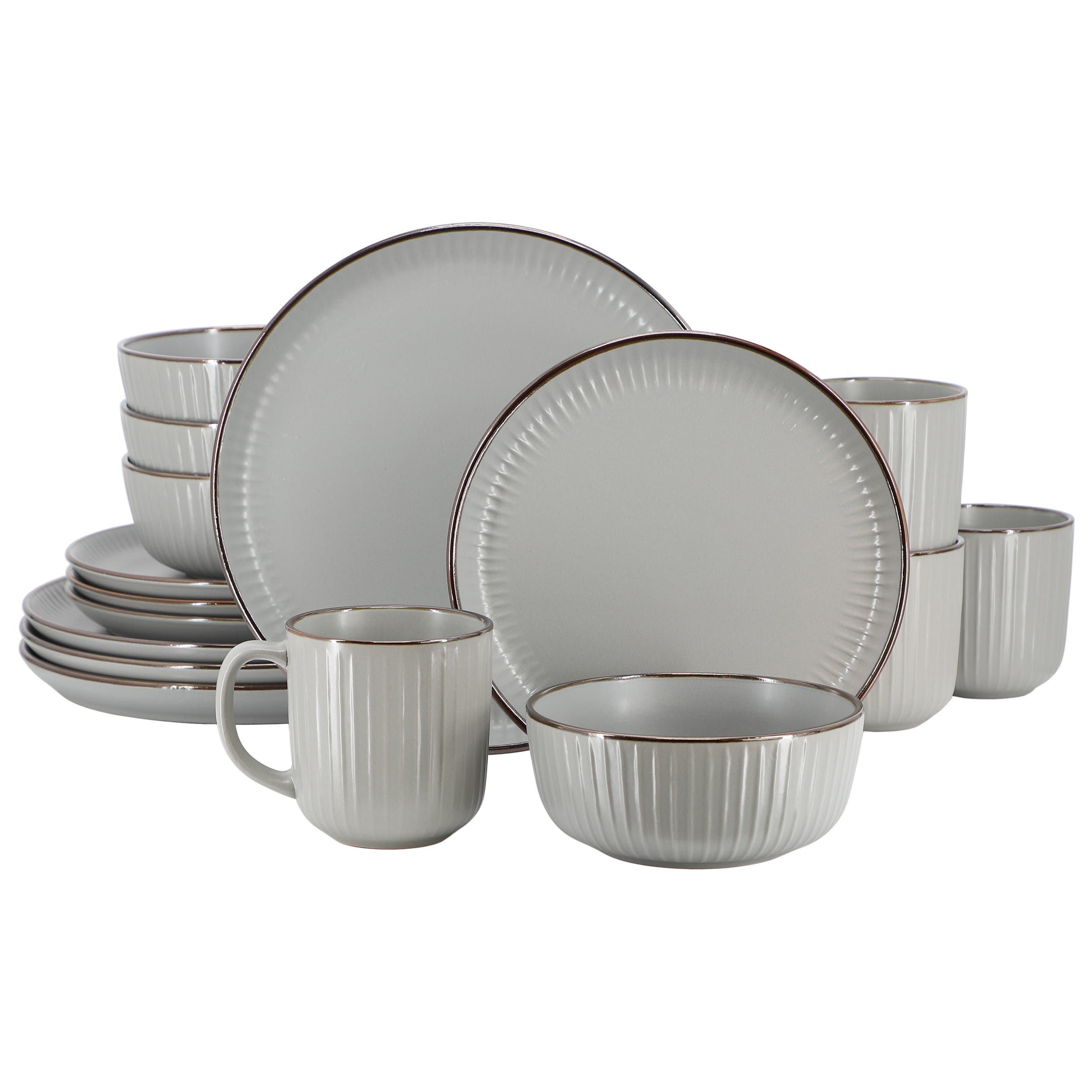Elevate your dining experience with the elama Leo 16-piece stoneware dinnerware set. Crafted with sophistication and durability in mind, this set boasts a sleek light gray finish that adds a touch of elegance to any table setting. Each piece is made from high-quality stoneware, ensuring long-lasting use. Whether you're hosting a formal dinner party or enjoying a casual meal with family and friends, the elama Leo dinnerware set is sure to impress with its contemporary design and timeless appeal. This 16-piece set includes everything you need to serve four people, including dinner plates, salad plates, cereal bowls, and mugs, making it perfect for everyday use or special occasions. The versatile design seamlessly complements any kitchen decor, while the dishwasher and microwave-safe construction provides added convenience for effortless cleanup and reheating. Whether you're savoring a quiet meal at home or entertaining guests, the elama Leo dinnerware set combines style and functionality to enhance your dining experience.# Pieces In Set: 16Included: 4 8 1/2 Inch Salad Plate(s), 4 6 Inch Bowl(s), 4 12 oz. Mug(s), 4 10 1/2 Inch Dinner Plate(s)Features: Lead Free, Microwave SafePlace Setting: Service for 4Shape: RoundBase Material: 100% StonewareCare: Dishwasher SafeDecor Styles: ModernMaterial: StonewareCountry of Origin: Imported