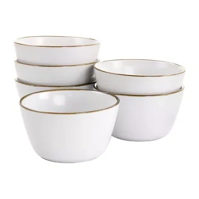 Add a beautiful accent to your dining table with the Arthur 6 Piece Bowl Set in sophisticated Matte White with Gold Rim Trim. Each piece is creatively crafted with a unique flat base and trimmed in gold. Beautifully finished off with a thin elegant gold rim, this set is a statement piece. Constructed of Stoneware, these bowls are ideal for special occasion gatherings and sturdy for every day use. Each bowl is microwave safe for quick reheating and dishwasher safe for easy cleaning. Mix an match with new pieces and pieces you've collected over the years.# Pieces In Set: 6Included: 6 5 1/2 Inch Bowl(s)Features: Dishwasher Safe, Microwave SafePlace Setting: Service for 4Shape: RoundBase Material: 100% StonewareCare: Dishwasher SafeDecor Styles: ModernMaterial: StonewareCountry of Origin: Imported